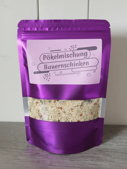 Schinkenherstellung leicht gemacht Mit unsere Pökelgewürzmischung Hausmacher Bauernschinken Unsere Empfehlung für Bauernschinken: Die Schweinehüfte aus der Keule Von unsere Pökelmischung 38/40g pro Kg Rohmasse, die Schweinehüfte mit der Pökelmischung einreiben und dann mit den ganzen Gewürz Vakuumieren und bei 7/9° Grad 3-4 Wochen lagern und alle 7 Tage den Schinken umdrehen. Nach der Pökelzeit den Schinken abwaschen und 4 Tage Durchbrennen lassen wenn der Schinken schön trocken ist ab in den Räucherofen und bis zur gewünschten Farbe Räuchern. Die genaue Herstellungsweise finden Sie hier auf der Seite in einem Video.