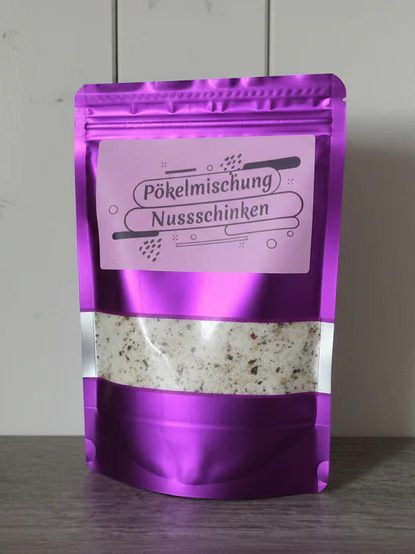 Schinkenherstellung leicht gemacht Mit unsere Pökelgewürzmischung Hausmacher Nussschinken Empfehlung für Nussschinken: Die Schweinenuss aus der Keule Von unsere Pökelmischung 38/40g pro Kg Rohmasse, die Schweinenuss mit der Pökelmischung einreiben und dann mit den ganzen Gewürz Vakuumieren und bei 7/9° Grad 3-4 Wochen lagern und alle 7 Tage den Schinken umdrehen. Nach der Pökelzeit den Schinken abwaschen und 4 Tage Durchbrennen lassen wenn der Schinken schön trocken ist ab in den Räucherofen und bis zur gewünschten Farbe Räuchern. Die genaue Herstellungsweise finden Sie hier auf der Seite in einem Video.